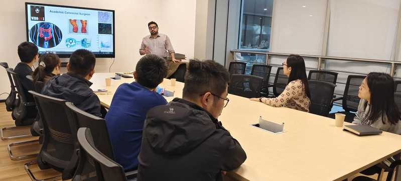 学术讲座在202会议室举行,由方慎彤老师主持。Muhammad Ahsan Javed教授以“Research initiatives in Colorectal Surgery”为题进行了讲座,深入浅出介绍了他们目前在结直肠癌与肠道微生物群表型联系方面的最新研究,并指出饮食干预在介绍结直肠手术前的重要作用。讲座结束后,Javed教授与在场师生展开了互动交流和深入探讨。